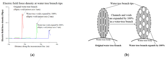 For a given void or a channel in a water tree as shown in Figure 8, due to the decline of elastic modulus with the rise in temperature, the XLPE material will become softer, which will result in easier diffusion of water molecules driven by the electric field force. Based on Hooke’s law, the size of voids and channels in the water tree both should expand due to the reduction of modulus. Moreover, with the rise in temperature, the water molecules easily diffuse around voids and channels because of increased molecules’ thermal motion. As a result, from Figure 4, it can be observed that the branches in water trees become wider with the increase in temperature. To simulate the water tree conditions under different temperatures, we assume the size of voids and channels in the water tree increases with the rise in temperature. According to the model and parameters in Figure 9b, electric field force densities at the void tips are shown at different expansion times of water tree branches as shown in Figure 10a. With the expansion in voids’ size, the electric field force obviously decreases at water tree tips. As shown in Figure 10b, because of the augment in size of voids with the increase in temperature, the radius of curvature at the void tip enlarges with it, and electric field force decreases at the void tip. As a result, it is possible that water tree propagation will be inhibited with the rise in temperature.