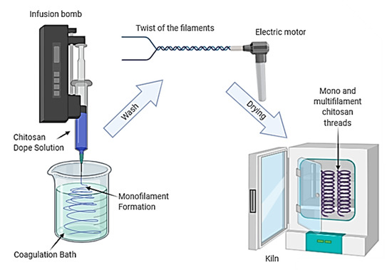 CS solution (4% w/v) was prepared as previously reported [22,23,24]. In short, CS was dissolved in a lactic acid aqueous solution (0.206 mol/L), in stoichiometric relationship with CS amine groups, at constant stirring (200 rpm) at 25 ± 1 °C for 2 h. The obtained CS solution was transferred to a syringe (20 mL capacity and 1 mm diameter outlet tip) for subsequent wet spinning. CS solution was extruded in the coagulation bath (70% of 0.5 M sodium hydroxide (NaOH) and 30% methanol) at a flow rate of 45 mL/h using an infusion pump (Pump 11 Pico Plus Elite, Harvard Apparatus, Holliston, MA, USA) at 25 ± 1 °C. Finally, the filaments were taken out, washed with distilled water until wash water reaches a pH close to 7. Multifilament CS threads were prepared by the twist of two or three wets spun monofilaments using an electric motor (RW 20 D, IKA, Campinas, SP, Brazil) (at 80 rpm), as Figure 1 shows. The length of monofilaments was fixed at 2 m and the torsion time was 90 s. Mono- and multifilament CS threads were subsequently kiln-dried at 60 ± 2 °C for 1.5 h.