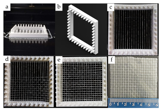 Preparation of the chitosan woven meshes from the weaving of chitosan threads: (a,b) views of the mold made by 3D printing; (c) the first plane of threads forming the textile warp; (d) secund plane of threads orthogonally inserted into the warp forming a plain weft (1/1); (e) chitosan woven meshes obtained by weaving, and (f) final chitosan woven mesh coated with a 1.5% chitosan solution.