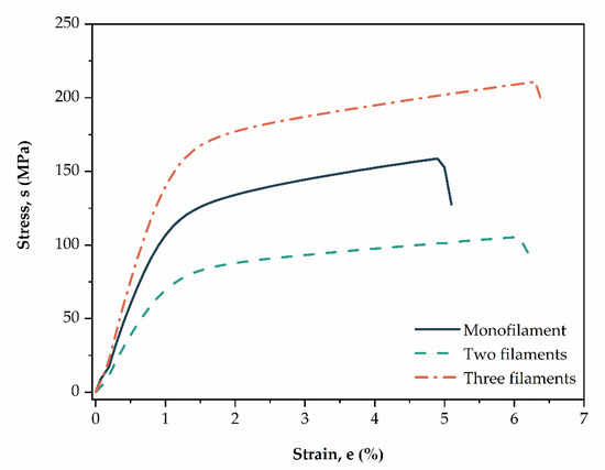 Figure 4 shows a representative stress vs strain graphic for CS threads obtained by uniaxial tensile test, and Table 2 summarizes the mean mechanical properties of the samples. Observed that monofilament CS thread showed intermediate mechanical properties between multifilament threads. This is confirmed in Table 2 with average values, where thread composed of two filaments showed the smallest values of tensile strength and elastic module. On other hand, the configuration with three filaments showed the highest values for the same properties. This may be due to the fact of thread with two filaments presenting greater porosity and pore size, due to the greater torsion angle (see Table 2), which caused the thread to become weak. Torsion of the CS filaments contributes to formed pores in the structure of threads, leading to uneven load distribution through the thread cross-section, causing a reduction in tensile strength [28,29]. This effect was also observed in our study previously reported [23].