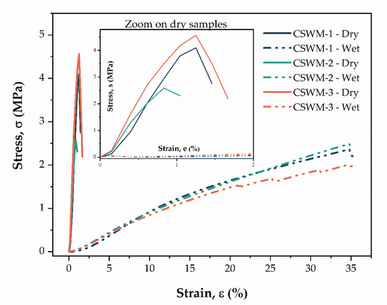 Figure 6 shows representative (n = 10) stress–strain curves for dry and hydrated CS woven meshes. Under elongation, the dry CS woven meshes exhibited a narrow elastic region with a high slope of the σ-ε curve, followed by failure at approximately 1% strain. On the other hand, hydrated samples showed a larger elastic zone of strain and lower slope of the σ-ε curve, with failure at approximately 35% strain.