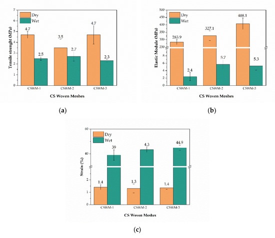 Mechanical behavior in a hydrated state is more important than a dry state to biomaterials applications, due to exposure to physiological fluids [30]. Thus, the mechanical properties of the CS woven meshes were evaluated by uniaxial tests in dry and wet states.