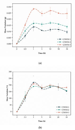 Swelling of the CS woven meshes was evaluated in PBS solution (pH = 7.4) at 37 ± 1 °C based on variation in absolute mass (g) and percentage (g) of the samples in periods of 0, 0.5, 1, 5, 10, 20, and 24 h. Figure 8a shows absolute mass variation and Figure 8b shows percentage mass variation. In absolute variations, samples composed of multifilament threads showed greater variation in mass, with the CSWM-3 sample being one with the greatest swelling. This is due to the greater number of filaments per unit area in the multifilament CS woven meshes. The swelling of CS-based materials in aqueous solutions is due to the formation of hydrogen bonds between absorbed water molecules and hydroxyl (OH) and free amino (–NH2) groups of CS [38,39]. Thus, the amount of fluid absorbed is proportional to the availability of these groups, that is, the amount (mass) of chitosan in the sample. Which justifies the biggest swelling of samples composed of multifilament threads.