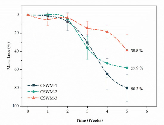In vitro enzymatic degradation of the CS woven meshes was evaluated by mass loss for a 5 weeks (35 days) incubation period in PBS solution containing lysozyme (pH = 7.34), in a concentration of 1.5 µg/mL, at 37 ± 0.5 °C [24]. Lysozyme is primarily responsible for the breakdown of CS in the human body. The in vitro tests is generally assessed using hen egg-white lysozyme [41,42,43], since it cleaves chitosan in its subunits, N-acetyl-glucosamine and glucosamine [44], facilitating its absorption and/or elimination through normal metabolic pathways [2]. Figure 9 shows the values of mass loss for CS woven meshes samples.
