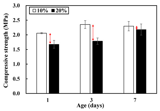 A preliminary experiment was performed to determine the appropriate moisture content for the red clay binder and the optimal compressive load to be exerted on the specimen in the manufacturing process. A controlled experiment was conducted as follows. First, the specimen mixing option was set to RP (red clay + PA) to estimate the moisture content in the red clay binder. The compressive strength (i.e., an independent variable) was measured when the moisture content in the red clay sample (i.e., a dependent variable) was 10% and 20%. Figure 2 depicts the compressive strength of the red clay binder with different age and moisture content combinations. The compressive strengths of specimen that have 10% moisture content is higher than that of specimens that have 20% moisture content in all three ages (i.e., after curing for 1, 3, and 7 day(s)). It is worth noting that the compressive strength of a specimen that has 10% and 20% moisture content is 2.4 and 1.7 MPa, respectively, after curing for 3 days, indicating that the difference in the compressive strength is the greatest in the 3 day age. It is confirmed that 10% moisture content in the red clay sample leads to a higher strength development rate in the combination with the PA solution; hence, it is more favorable than the 20% moisture content.