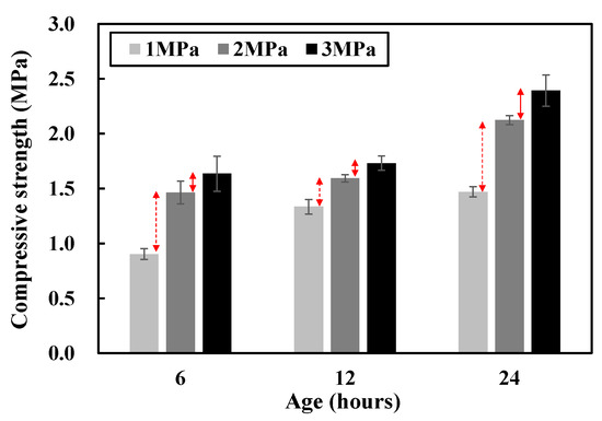 Second, the optimal compressive load is determined for specimens used in manufacturing the red clay binder. While the mixing combination of the specimen onto the RPC is kept constant (i.e., red clay + PA solution + cement), the compressive strength is measured by manipulating the compressive load with three loading values (i.e., 1, 2, and 3 MPa). Figure 3 shows the compressive strength measurement results for determining. The deviation between the compressive strength, given compressive loads of 1 MPa and 2 MPa, is approximately 0.3 MPa less, on average, than the deviation given those of 2 MPa and 3 MPa. It appears that the older the specimen age, the more the deviation. Given a compressive load of 1 MPa, the compressive strengths of the 6, 12, and 24 h specimens are 0.9, 1.3, and 1.5 MPa, respectively, which do not meet the optimal compressive strength requirement (i.e., 2 MPa) for REC (300 psi (2.07 MPa)) [6].