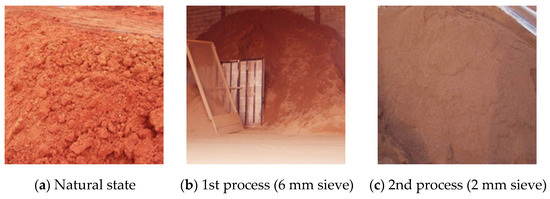 In the case of commercial red clay, it has a porous structure containing numerous halloysite-based micropores, consisting chemically of SiO2, Al2O3, Fe2O3, and its chemical composition is similar to other pozzolanic materials [22,23,24]. Figure 4 shows the red clay used in this study. To ensure a uniform particle size, the clay used in this study underwent natural drying after collection and was sifted through a 2 mm sieve before mixing. The density and loss ignition of the red clay was 2.7 g/cm³ and 9.27%, respectively.