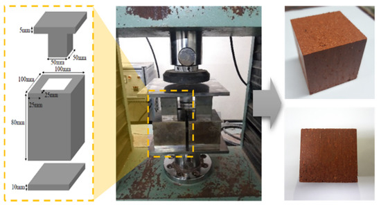 Specimens with dimensions of 50 mm × 50 mm × 50 mm were manufactured by using the mold and manufacturing apparatus shown in Figure 6. The mold was filled with a 240 g sample by pouring the materials three times in the same quantity, considering the gravity of the red clay and the threshold compressive load. Specimens were compacted uniformly by applying 2 MPa with the UTM. The fabricated specimens were cured in a chamber at a constant temperature and humidity as already mentioned.