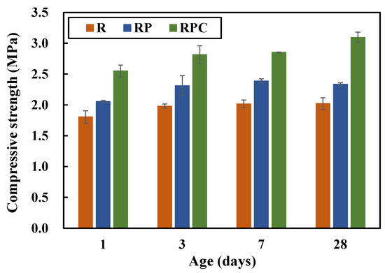 RPC exhibits considerably higher compressive strengths than R and RP. It is remarkable that the compressive strength of RPC on the first day is 2.5 MPa, which meets the “28 days” compressive strength standard (2.4 MPa) recommended by ACP-EEC [5]. The strength improvement can be attributed to the secondary bonds of the PA solution, and the hydration reaction of cement contributes to the enhancement. Existing studies have claimed that the fit-for-use strength may be achieved by adding more than 8–12% of cement in REC [4,14]. It is found that RPC, which reduces the amount of cement added to 5 wt% of the binder, outperforms with respect to the compressive strength criteria suggested by the regulation.
