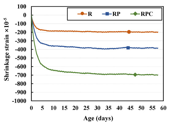 The shrinkage deformation occurs rapidly in all three red clay binder specimens (i.e., R, RP, and RPC) in their early ages, as shown in Figure 8. It decelerates gradually as their age increases. The shrinkage deformation of RP is larger than that of R. This can be explained by the evaporation of water molecules held together by hydrogen bonds between the solid poly(AA-co-AM) in the PA solution and the silica particles of red clay. The compressive strength of RP is slightly higher than that of R. It appears that the binding force attributed to the hydrogen bonds between poly(AA-co-AM) and silica particles contributes to the strength improvement. The shrinkage deformation of RPC is larger than that of R and RP in the early age. The volume change of the red clay binder, which occurred owing to the micropores generated inside the binder as the cement absorbs the moisture from the binder during the hydration reaction, may contribute to the deviation.