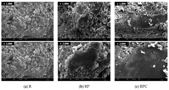 The main ingredients of R, RP, and RPC are SiO2, Al2O3, Fe2O3, and CaO, which can be confirmed through XRF analysis of the red clay binder, as shown in Table 4. The mechanical performance of each specimen varies based on the compositional ratio of CaO and SO3. It is well known that the compositional ratios of CaO and SO3 in OPC are approximately 66% and 2%, respectively [28,29]. The ratios of CaO and SO3 in the RPC are higher than those in R and RP. In addition, the ratios of SiO2 and Al2O3 in all red clay binder specimens vary from 75% to 81%. Certainly, the addition of moisture encourages strength development by catalyzing the pozzolanic reaction with Ca(OH)2.
