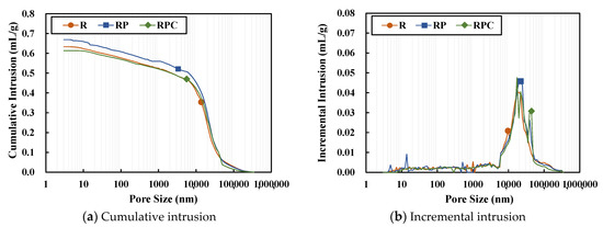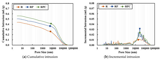 The MIP analysis on the red clay binder specimens of 7 days and 28 days age confirms that diameter of the pores inside the red clay binder specimens is between 104 and 105 nm, as shown in Figure 12 and Figure 13, respectively. The cumulative porosities of RP and RPC are higher than those of R for the 7 days age. This may be because of the copolymerization of AA and AM using the initiator, which formulates the poly(AA-co-AM). It appears that the molecules are at a distance of approximately 104–105 nm from each other during the molecular bonding in the copolymerization process, thereby affecting the cumulative porosities [19]. Although the cumulative porosity of RP is higher than that of R, the compressive strength of RP is higher than that of R. It appears that the strong binding force achieved by the hydrogen bonding between the solid polymer and the silica particles contributes to the strength improvement in RP.