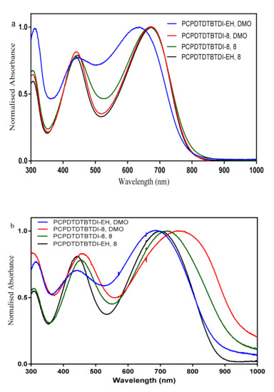 PCPDTDTBTDI-EH, DMO and PCPDTDTBTDI-EH, 8 have comparable absorption coefficients (ε) and their coefficients are slightly higher than PCPDTDTBTDI-8, 8. PCPDTDTBTDI-8, DMO has the highest absorption coefficient among all polymers prepared. This could be attributed to the PCPDTDTBTDI-8, DMO having the highest absorption maxima of about 759 nm in solid state, and it is red-shifted by more than 80 nm compared to solution among all polymers (Table 2).