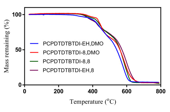 Thermal properties of the polymers were studied by TGA (Figure 3 and Table 3). All polymers show high thermal stability with decomposition temperatures up to 370 °C. It is interesting to note that the thermal stability of the polymers with linear n-octyl chains on CPDT repeat units is higher than those polymers with branched 2-ethylhexyl chains. In addition, the thermal stability of the PCPDTDTBTDI-EH DMO and PCPDTDTBTDI-EH, 8 is not affected by the nature of substituents on BTDI units, while changing the 3,7-dimethyloctyl chains in PCPDTDTBTDI-8, DMO to n-octyl chains in PCPDTDTBTDI-8, 8 on the acceptor moieties has a negative impact on the thermal stability of the polymers. It was tentatively hypothesized that the polymers with n-octyl chains are more planar than those with 2-ethylhexyl chains; therefore, they might need higher temperature to decompose. Moreover, the differences in thermal stability of the polymers are probably due to different molecular weights of the polymers.