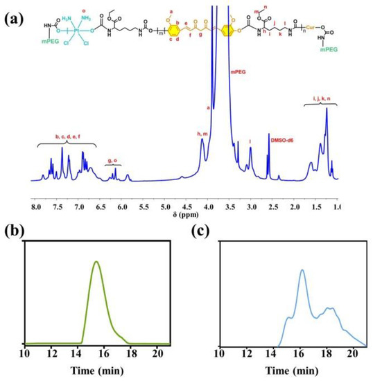 (a) 1H NMR spectrum of PCPt (400 M, DMSO-d6), (b) GPC curve of PCPt, and (c) GPC curve of PCPt treated with 10 mM SA for 12 h.