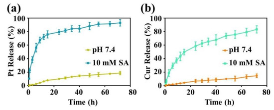 In order to achieve combination chemotherapy, cisplatin derivative was copolymerized with curcumin to give a co-delivery system (PCPt NPs). The ideal nanodrugs for chemotherapy should possess several merits. One of the merits is high drug loading content, high drug loading efficiency and generation of sufficient concentration in the target cancer cells. Thus, the drugs concentration is important. The drug loading content (DLC) of Pt and Cur were calculated to be approximately 9.7% and 9.1%, respectively. Since Pt(IV) was conjugated onto the backbone of PCPt, drug release behaviors of the PCPt NPs would be reduction dependent. The release of Pt and Cur from PCPt NPs was investigated using a dialysis method in PBS (pH 7.4) or 10 mM SA. As shown in Figure 4a, rather slow Pt release was detected at pH 7.4, only about 18.8% of the Pt was released after 72 h, indicating that the PCPt polymer and NPs are stable in neutral condition. As expected, the release rate of Pt was increased significantly upon the addition of 10 mM SA, the cumulative Pt release amount reached to 93.3% after 72 h, which proved that the Pt release was reduction-dependent, and PCPt NPs could be degraded at reductive environment based on the breakage of Pt(IV). The results of Cur release were similar to Pt release (Figure 4b), the release of Cur from PCPt NPs was significantly enhanced under reduction condition (10 mM SA). PCPt NPs showed approximately 83.3% Cur release after 72 h incubation with 10 mM SA, only 14% of Cur was released at pH 7.4. Notably, the in vitro release of Cur was slightly lower than Pt in aqueous solution with 10 mM SA, which might be due to the lipophilicity of Cur. Therefore, the reduction responsive PCPt NPs held great potential in developing smart carriers for the combination treatment of cancer. Pt and Cur was introduced into the PCPt via urethane linkage. The urethane linkage could be slowly hydrolyzed, and the conjugated drugs were released. Therefore, the Pt and Cur release in the PBS 5.0 was also investigated (Supplementary Materials Figure S8). Compared to the drugs released in PBS 7.4, the release rate was slightly increased.