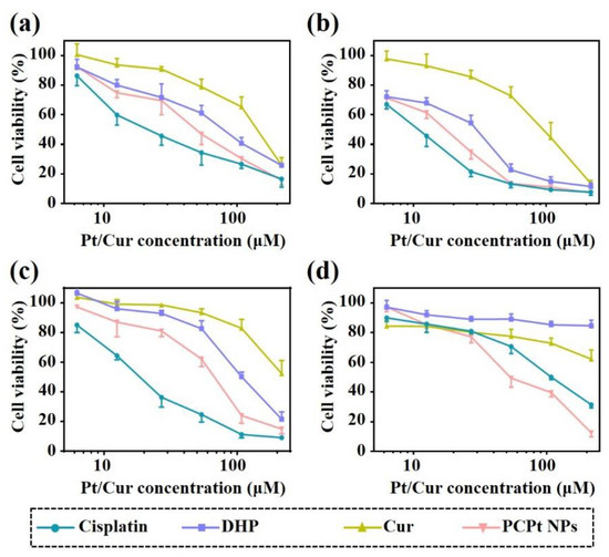 To evaluate the in vitro efficacy of overcoming multidrug resistance (MDR), cell viability of A549 and A549/DDP against cisplatin, Cur, DHP, and PCPt NPs were measured with a MTT assay. Cells were seeded onto 96-well plates (5000 cells/well). After incubation for 24 h, cells were exposed to the drugs with different concentrations (6.25 to 216 µM). After co-incubation for 48 h, and cells were treated as depicted above. Cells treated with blank DMEM media were negative controls.