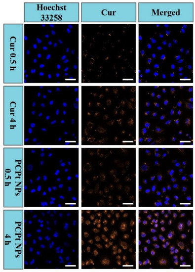 Besides, in vitro cellular uptake of free Cur and PCPts was quantified by flow cytometry. HeLa cells were planted into 6 well plates at 3 × 105 cells per well in 2 mL DMEM media. After 24 h incubation, free Cur and PCPts (final concentration of Cur fixed at 15 μg/mL) dissolved in 500 μL of PBS were added and cultured for another 1 or 4 h. Then, the original medium was removed, and cells were washed with PBS for 3 times. The cells were detached with trypsin, collected by centrifugation. Finally, cells were resuspended in 500 μL of PBS and were studied by flow cytometer.