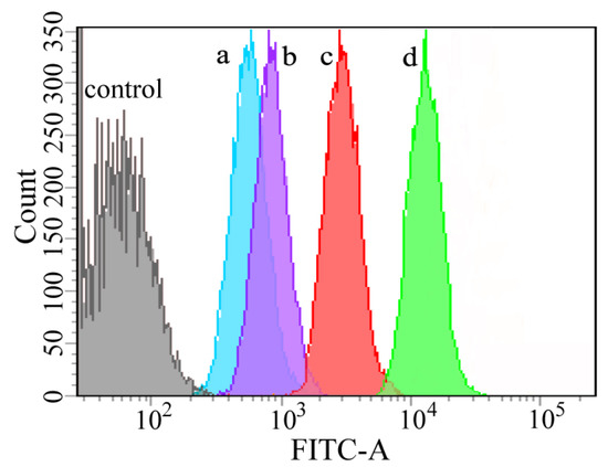 Flow cytometry analysis of HeLa cells treated with free Cur for 1 h (a), PCPt NPs for 1 h (b), free Cur for 4 h (c), and PCPt NPs for 4 h (d).