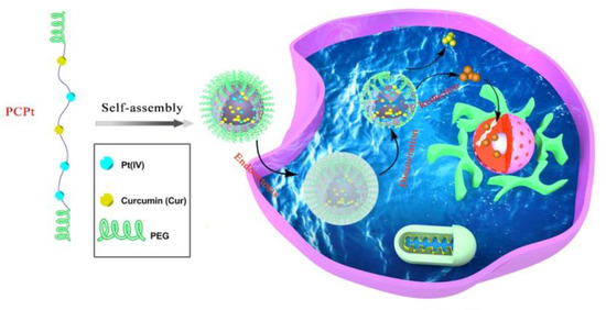 The PCPt NPs were prepared as follows: PCPt (20 mg) was dissolved in 2 mL of DMSO, at room temperature, in dark condition. The solution was dropwise injected into 20 mL of Milli-Q water, under stirring. After 4 h, the suspension was dialyzed against deionized water, for 48 h, to remove DMSO. Then, the solution was filtered through a 0.45 μm filter membrane, to obtain PCPt NPs. The mixture was stored at 4 °C for further characterizations and use. The particle size, size distribution, and morphology were characterized by DLS and TEM. The Pt/Cur loading content and Pt/Cur-loading efficiency in the filtrate were calculated according to previous methods [43,48].