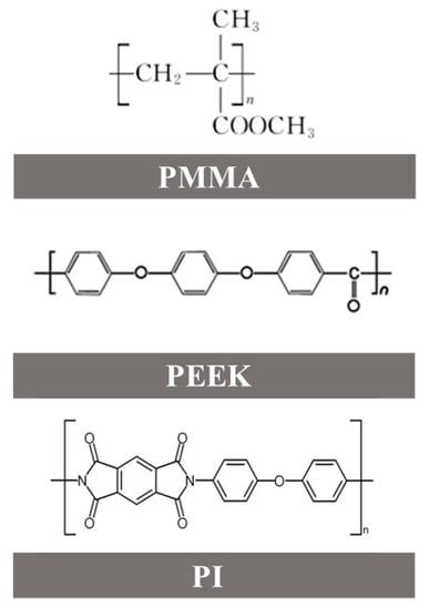 Chemical structures of poly(methyl methacrylate) (PMMA), polyetheretherketone (PEEK) and polyimide (PI).