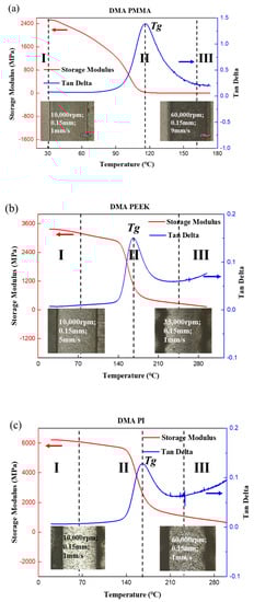 According to the results, the Tg for three kinds of PMMA, PEEK, and PI are 116 °C, 167 °C, and 166 °C, respectively. Three distinct regimes, such as the glassy regime, viscoelastic regime, and the rubbery regime, could be found, and different groove structures are shown in Figure 3a–c. As shown in Figure 3a, when the processing temperature was higher than 160 °C, which was larger than Tg, obvious burrs were observed along the groove. The DMA results of PEEK are shown in Figure 3b, and the Tg of PEEK was about 167 °C, which was much higher than that of PMMA. When the temperature was at about 70 °C, the edge of the groove was neat without obvious burrs. If the processing temperature were about 240 °C, which is near the Tg of PEEK, the groove shape of the PEEK sample would be ruined. The DMA characteristics of PI were similar to that of PEEK according to the results displayed in Figure 3c. The Tg of PI was about 166 °C, and the groove edge quality was also very good. With the increase of temperature, the edge shape was ruined, and big burrs or sintered edges could be observed. On the whole, when the polymers were in the glass state, the material could be removed in a brittle way. With the temperature rising, the polymers were in the viscoelastic or rubbery state, big burrs could be found on the groove edges, and the material was melted or burned from the bulk material.