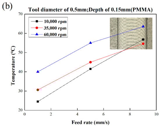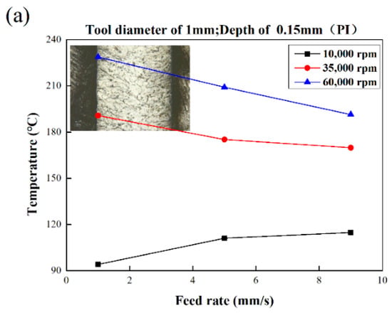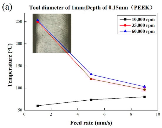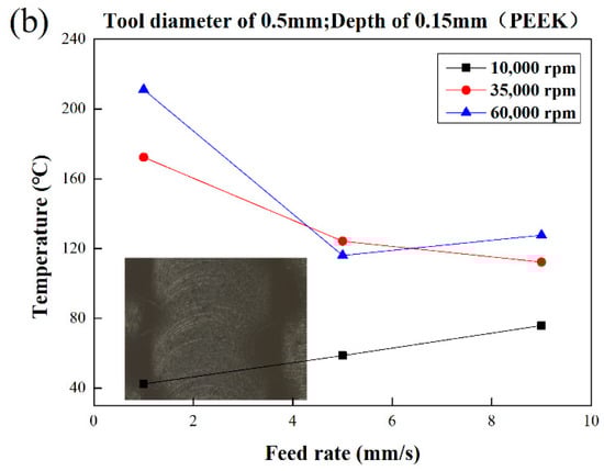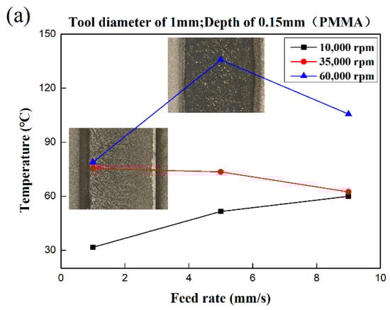 The relationships of milling processing temperature and processing parameters for three workpieces are shown in Figure 4, Figure 5 and Figure 6. The black, red, and blue lines represented three spindle speeds: 10,000 rpm, 35,000 rpm, and 60,000 rpm, respectively. It can be observed that the milling temperature of the three materials increased with the increase of the spindle speed. The groove bottom morphology was displayed under certain points in figures, and different material removal characteristics can be observed.