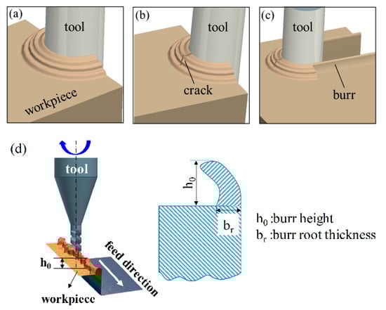 Modeling of burr formation during micro end milling: (a–c) The milling process of polymer, (d) the schematic of burr height and burr root thickness.