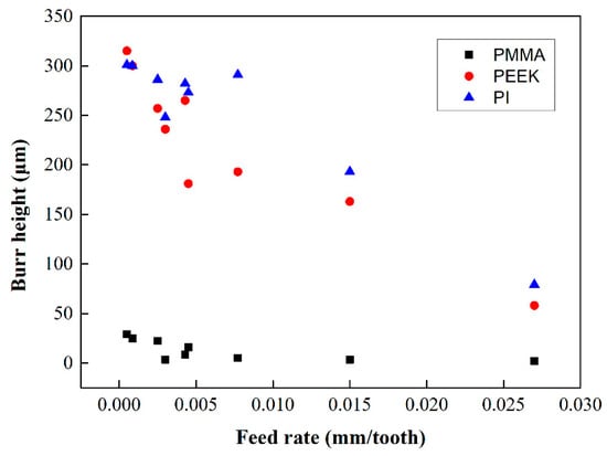- The average size of PMMA burrs is much smaller burr than that of PEEK and PI under the same conditions. For example, when milling with a 0.5 mm cutter, the burr height of PMMA is within 50 μm. However, the burr height of PEEK and PI was up to two or three hundred micrometers. According to the results, the decrease in the feed rate will promote the generation of burrs. This is because when the feed rate is less than the thickness of the burr root, residual material will accumulate together, which is the top burr;