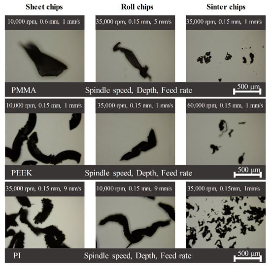 According to the results, the shape of the cutting chips was determined not only by spindle speed, cutting depth, or feed rate but also was determined by the comprehensive effect of processing parameters. For the PMMA sample, the cutting chips were in the sheet and sinter shapes with the same feed rate of 1 mm/s but different spindle speed (10,000 rpm, 35,000 rpm) and cutting depth (0.6 mm, 0.15 mm). However, for the PEEK sample, the cutting chips changed from the sheet shape to the roll shape and sinter shape with the increasing of spindle speed. As for the PI sample, the sinter cutting chips were generated with a smaller feed rate under the same spindle speed and cutting depth.