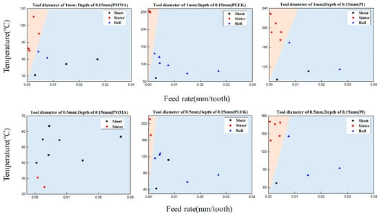 The cutting chips distribution of PMMA, PEEK, PI with temperature, and feed rate are shown in Figure 10, and two distinct regimes in pink and blue were classified according to the cutting chip shapes. The cutting chips in the pink regime were in the sinter shape, and the cutting chips were in the sheet and roll shape in the blue regime. The red circles represent the sinter chips, the blue triangles represent the roll chips, and the black squares represent the sheet chips. In general, the sintered chips are concentrated in regimes with lower feed rates and higher temperatures. When the feed rate is high and the temperature is low, the chip forms appear as sheet chips and roll chips.