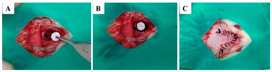 Surgical procedures for scaffold implantation in 8 mm calvaria defect. Surgical bone defect (A), scaffold implantation in situ (B) and defect sutured (C).