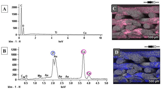 The elemental composition of uncoated PLA scaffolds, accessed by the EDS spectrum, showed that the PLA’s main elements were carbon and oxygen, as expected (Figure 4). After biomimetic coating, it is possible to see the presence of calcium and phosphorous peaks, suggesting an effective deposition of apatite on the scaffold’s surface. A small titanium peak was also observed in uncoated PLA scaffolds (Figure 4A). It can be related to titanium dioxide (TiO2), present in the composition of a wide range of white pigments commonly used in various industries [65]. Element maps illustrating the distribution of calcium (Figure 4C) and phosphorous (Figure 4C) on the fracture surface of PLA-CaP scaffolds showed a uniform coating throughout the thickness of the scaffolds.