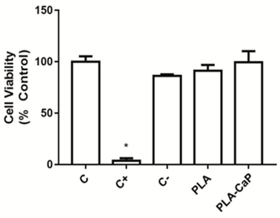 Before assessing cell-surface interactions, a standardized cytocompatibility assay was performed according to ISO10993-5:2009 [59] in order to determine if the scaffolds could indirectly affect cell viability. PLA and PLA-CaP scaffolds were immersed in DMEM (Dulbecco’s Modified Eagle Medium) at 200 mg/mL ratio and incubated for 24 h at 37 °C/5% CO2 to produce conditioned media for indirect cell exposure.