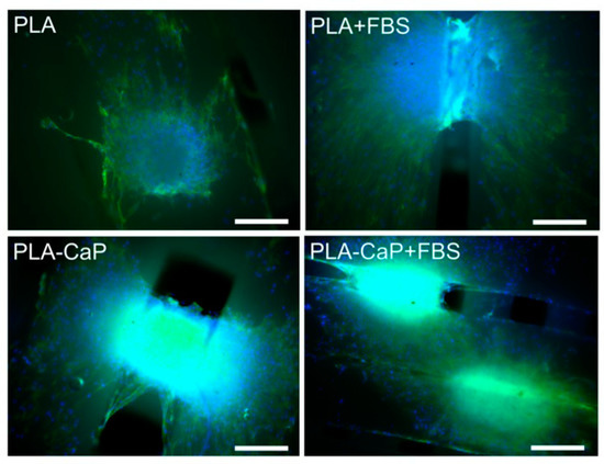 Fluorescence microscopy images of HOb osteospheres cultivated for 7 days over surfaces of PLA, PLA-CaP scaffolds, pre-treated or not with FBS. Cell nuclei appear in blue, and actin microfilaments marked in green. Images obtained either with ×10 objectives. Bars indicate 200 µm.