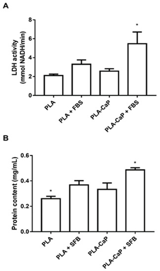 Total cell and spheroid over each surface were estimated through the detection of LDH, and total protein content after cell permeabilization (Figure 8). While there was no significant difference between uncoated PLA and PLA-CaP scaffolds, it was possible to observe, from both parameters, that PLA-CaP+FBS had a significant (p < 0.05) presence of cells observed in pure PLA.