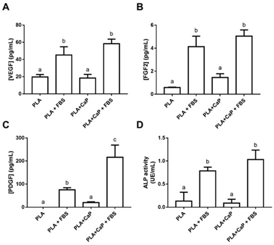Figure 9 shows the biological mediators secreted by the HOb cells and spheres loaded in the scaffolds after seven days. The analysis of released FGF-2, PDGF, and VEGF shows that groups pre-treated with serum presented higher levels of secreted growth factors (p < 0.05). In the case of PDGF, the FBS-treated biomimetic coating induced close to a threefold increase when compared to uncoated PLA + FBS (Figure 9C). Alkaline phosphatase (ALP), an important biomarker of the initial steps of osteoblast engagement on mineralization, was measured in cells adhered to the scaffolds after permeabilization with triton X100 (Figure 9D). Similar to the growth factors, the ALP secretion was significantly increased in the FBS-treated groups (even after the removal of background activity), with the higher activities observed with PLA-CaP-FBS (1.03 UE/mL).