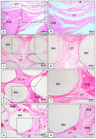 In the in vivo assessment, a quantitative description of the volume density of newly formed bone, biomaterial (scaffold), and connective tissue was done by parametric description with a p-value of < 0.05 considered significant. The obtained data were not normal (Shapiro-Wilk normality test); they were transformed in Y logarithm, and a p-value < 0.05 was considered significant. ANOVA and Tukey’s post-tests were used to investigate the differences between groups at the same experimental period and differences between the same group at different times. The calculations were performed using Prism Graph Pad 7.0 software (Inc., La Jolla, CA, USA).