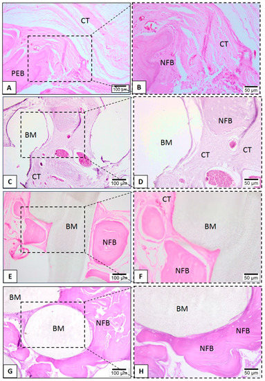 The bone blocks containing the scaffolds were collected according to the protocol of the Applied Biotechnology Laboratory/Federal Fluminense University (LABA/UFF, Niterói, RJ, Brazil). The decalcification of calvarias was achieved with 10% buffered ethylenediaminetetraacetic acid (EDTA) for 2 days at room temperature before the histological processing. The samples were fixed in 4% buffered formalin (pH 7.4) for 48 h and washed in running water for one hour, dehydrated in crescent alcohol solutions, diaphanized in xylol, and included in paraffin. At the end of the processing, they were cut in a microtome (Jung-Leica RM 2054, Nussloch. Germany) with 5 μm thickness and stained with hematoxylin-eosin (HE) for descriptive evaluation of newly formed bone, the pattern of scaffolds, and connective tissue.