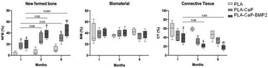 Forty-five Wistar rats, weighing between 300 and 400 g, were randomly divided into three experimental groups as follows: PLA, PLA-CaP, and PLA-CaP plus 5 μh rhBMP2 (Infuse® Bone Graft Small Kit, Medtronic Spinal and Biologics, Memphis, TN, USA) (PLA-CaP-BMP2) (n = 15). The scaffolds implantation was conducted following ISO standard 10993-6 [62]. The animals were also randomly divided into three experimental periods of 1, 3, and 6 months (n = 5).