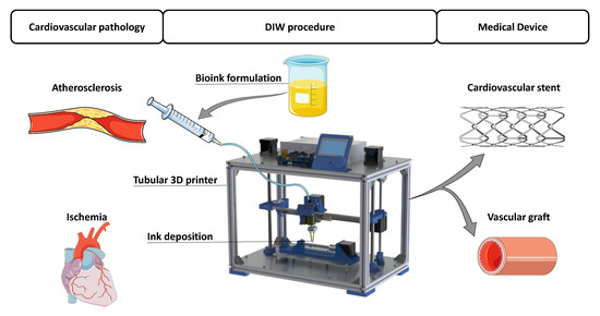 Additive manufacturing methods are gaining prominence due to the ability to customize the shape of the carried out applications in an inexpensive manner. That is why many teams are researching innovative technologies to extrude different types of material. The most common, Fused Deposition Modeling (FDM), was developed by S. Scott Crump [1] and is also known as Fused Filament Fabrication or Free Form Fabrication (FFF). This method employs the viscoelastic characteristic of shear thinning behavior of non-Newtonian thermoplastic materials, which easily flow under shear stress and quickly recover upon deposition, to produce a continuous filament during the printing process. Thus, the molten material is subjected to mechanical pressure, leading to shear deformation as it passes through the nozzle system, high shear forces. Then, it is collected on the deposition bed where it is cooled following a precise pattern. Once deposited, the shear force is no longer present, it cools and maintains its conformation due to its rapid cooling and low specific heat capacity. These phenomena rapidly increase its viscosity due to the shear thinning feature. Therefore, the material shows higher resistance to deformation. In addition to the property of shear thinning, to use this technique, the material must encompass the ability to make a filament with the desired printed material, as well as heat the material to the melting point and have a low specific heat capacity [2]. Hence, there is a limited stock of materials that fulfills these demands and, therefore, can be applied to that technique. However, there are many materials that possess the ability of shear thinning, in addition to other properties [3,4]. Sandia National Laboratories, in 1996, defined another way to deposit polymers, which they called robocasting [5]. Today, this technique is well known as Direct Ink Writing (DIW). This technology is based on the extrusion of viscoelastic pastes, also referred as ’inks’, through a nozzle (50 m to 1.25 mm [6,7]), forming a 3D structure. The shear thinning property in DIW is even more crucial than in FDM, since no heat treatment is conducted, therefore the material relies exclusively on this feature to harden after being deposited on the bed. The shear stress to create the flow is generally generated by the action of a pneumatic or mechanical piston or an Archimedes screw that is connected to the syringe barrel containing the ink [8]. Consecutively, this mechanism is coupled to a nozzle that is mounted on a 3-axis carriage that precisely controls the placement of the deposited material. That technology offers a whole new range of polymeric materials in which additive manufacturing can be carried out. Employing this technique, materials like epoxy resins [9,10], preceramic polymers [7,11,12,13,14], natural polymers [3,15,16], or conductive composite polymers [17,18,19,20,21] can be tailored as convenience for biomedical applications. Furthermore, it is the preferred technique for printing living cells by mixing them in hydrogels due to the high survival rate [22,23,24,25,26], in addition to the biocompatible water-rich environment that simulates the extracellular matrix (ECM) [27]. DIW has several advantages for biomedical applications. This new additive manufacturing approach is very interesting for the elaboration of more complex tissues that require a precise control of cell deposition for their subsequent interactions and development. Being able to customize or specifically tailored each application for its final user during the fabrication process adds an added-value that cannot be provided by industrialized manufacturing processes [19,28,29]. DIW has the ability to build any desired shape or construction with any material that encompasses the shear thinning property. In addition, a multimaterial ink can be blended, providing characteristics of interest of both components and creating very attractive biomedical engineering devices [6,18]. DIW is gaining more and more presence within the cardiovascular tubular medical treatments, as the implicit viscoelastic property required to conduct the technique is ideal for the deposition of the ink on a tubular rotating bed. That is why this review delves into this novel field which might embrace solutions to very common problems today.
