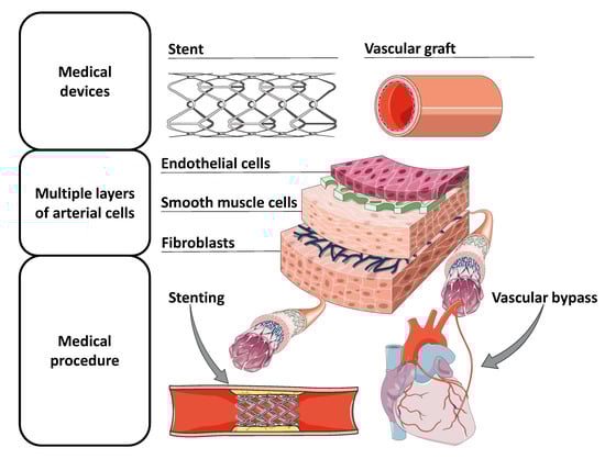 Tubular medical equipment for the treatment of cardiovascular pathologies, representation of the cell layers of arterial vessels, and their implementation within the human body [41].