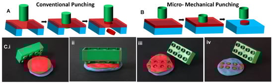 (A) Conventional punching vs. (B) micromechanical punching; (C) do-it-yourself punching using Playdough® and Lego® block showing the basic steps of the MMP process: (i) sample preparation, (ii) MMP, (iii) demolding the mold from the microparticle layer, and (iv) microparticles obtained on the deformable substrate after peeling off the surrounding punched film (Green: Hard mold; red: Microparticle layer; blue: Deformable substrate).