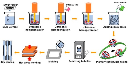 The MWCNTs used in this study were supplied by Applied Nanotechnologies, Inc., Austin, TX, USA. The diameter and the length of the employed MWCNT are ranged from 20 to 40 nm and from 10 to 20 μm, respectively. The utilized GNPs with the designation of KNG-150 were purchased from Kano Co., Xiamen, China. The diameter of the GNP is approximately 1–20 μm, and the thickness is about 5–15 nm. Both the purities of employed CNTs and GNPs are larger than 99.5%. The solvent-type epoxy, designated EPO-622 and fabricated by Epotech Composite Co., Taiwan, was utilized to prepare the matrix material. The as-received epoxy solvent contains epoxy resin, dicyanamide curing agent, and methyl ethyl ketone (MEK) solvent. The weight ratio between the epoxy resin and curing agent is 18:2.