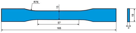 The procedure of preparing the specimens is illustrated in Figure 1. The MWCNTs and GNPs were heated at 120 °C for 1 h first to remove the moisture. The dried nano-fillers with required weight ratio were added in the MEK solvent. The suspension was then agitated for 20 min using an ultrasonic homogenizer. Next, the surfactant Triton X-405 (Sigma-Aldrich, Inc., St. Louis, MI, USA) was added in the mixture and the solution was agitated continuously for 10 min using an ultrasonic homogenizer to obtain the uniform dispersion of nano-fillers in MEK. Afterwards the suspension was mixed with the solvent-type epoxy using a planetary centrifugal mixer for 20 min. The mixture was then heated in a vacuum oven at 80 °C for 90 min to remove the MEK and bubbles from the blend. Then the mixture was poured into a mold and remained heated in a vacuum oven for 90 min. Next the blend was cured by hot-pressing at 150 °C with applying the pressure from 0 to 1000 psi gradually to obtained the solidified nanocomposites. The solidified composite plate was cut into the specimens according to the required shape and dimensions specified by the ASTM (American Society for Testing and Materials) standard D638 []. The shape and dimensions of the specimen are illustrated in Figure 2.