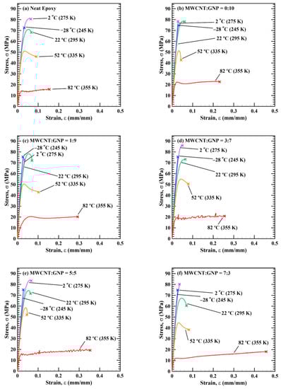 Stress–strain curves obtained in the quasi-statically tensile tests at various temperatures for the studied nanocomposites with the MWCNT:GNP ratios of (a) 0:0, (b) 0:10, (c) 1:9, (d) 3:7, (e) 5:5, (f) 7:3, (g) 9:1, and (h) 10:0.