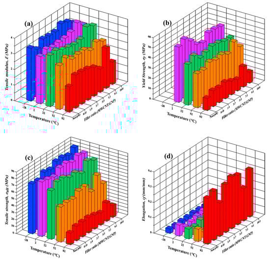 Variation of (a) tensile modulus, (b) yield strength, (c) ultimate strength, and (d) elongation of the studied nanocomposites with the temperature and the filler ratios.