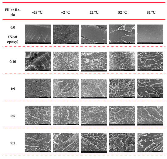 Figure 7 also shows that at each specific temperature, the fracture surface of the specimen with a MWCNT:GNP ratio of 9:1 shows smaller cleavage planes when compared with those with other filler ratios. Furthermore, the height difference between the cleavage planes of the specimen with a filler ratio of 9:1 is larger than those with other filler ratios, meaning that the rougher fracture surfaces are observed. The mechanism also clarifies why the nanocomposites with a MWCNT:GNP ratio of 9:1 has a higher monotonic strength than those with other filler ratios.