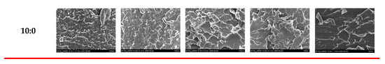 The secondary mechanism to improve the mechanical properties of the nanocomposites is the bridging effect of the employed nano-fillers. The bridging of nano-fillers across the cracked matrix retards the further growth of crack. The bridging mechanism on the room-temperature properties has also been observed in the CNT-based nanocomposites [,,,,], graphene-based nanocomposites [,,], and hybrid nanocomposites [,,,]. Figure 11b,c show the SEM micrographs of MWCNT and GNP bridging for the studied nanocomposites with the MWCNT:GNP ratios of 9:1 and 1:9 observed at 52 °C, respectively. It is noted that whether the bridging effect is valid depends on the adhesion between the nano-fillers and the matrix. Strong wrapping the nano-fillers by the matrix implies the mechanical properties of the studied nanocomposites almost come from the strength of the nano-fillers themselves. The adhesion between the fillers and the matrix decreases significantly when the specimens are tested at high temperatures, further reducing the strength of the studied nanocomposite. Figure 12 shows the fracture surface images of the nanocomposites with the MWCNT:GNP ratios of 9:1 and 1:9 obtained in the fatigue tests performed at 82 °C, respectively. The pullout of CNTs and GNPs from epoxy polymer matrix indicates the loss of interfacial strength between the fillers and the matrix at high temperatures, implying the low strength of the studied nanocomposites at high temperatures.