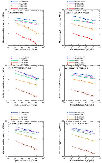 Temperature-dependent S-N curves for the nanocomposites with the MWCNT:GNP ratios of (a) 0:0, (b) 0:10, (c) 1:9, (d) 5:5, (e) 9:1, and (f) 10:0.